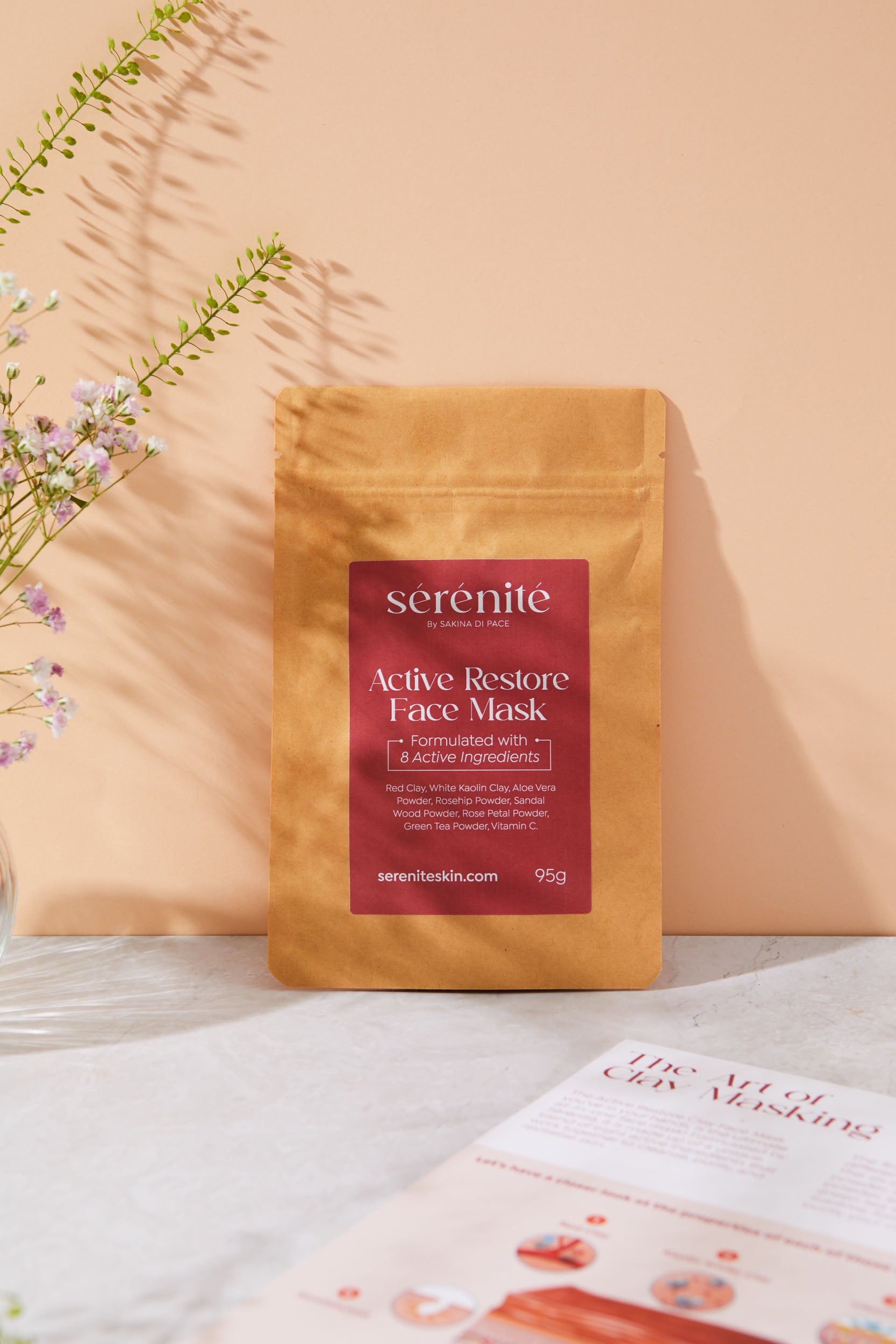 The Active Restore Face Mask is the ultimate all-in-one face mask! It is a unique blend of 8 active ingredients formulated by Sérénité working together to cleanse, purify, and revitalise skin elaborated from two different clays from Sardinia and Brittany.